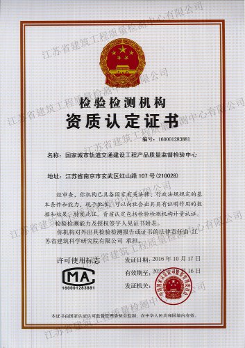 國家城市軌道交通建設工程產品質量監督檢驗中心, 依托江蘇省建筑科學研究院和江蘇省建筑工程質量檢測中心在城市軌道交通建設工程領域的綜合技術優勢,于2016年10月獲得國家認證認可監督委員會批準授權..